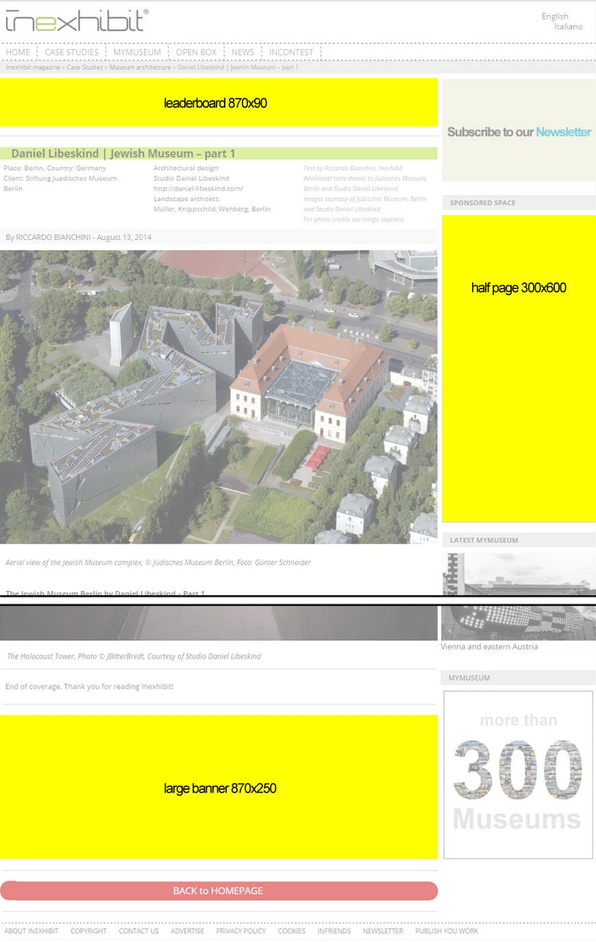 Your featured content will be published in English and Italian and will be highlighed in the homepage of Inexhibit for a full month; thereafter, it will be archived in a dedicated section and remain available to our readers forever.