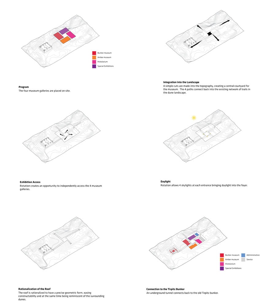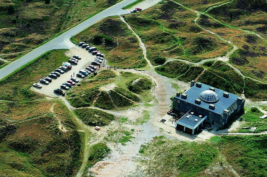 The visitors enter the museum through a footpath cut into the surrounding dunes and connected to a trail network that runs across the site; an underground passage then links the museum to the Tirpitz bunker.