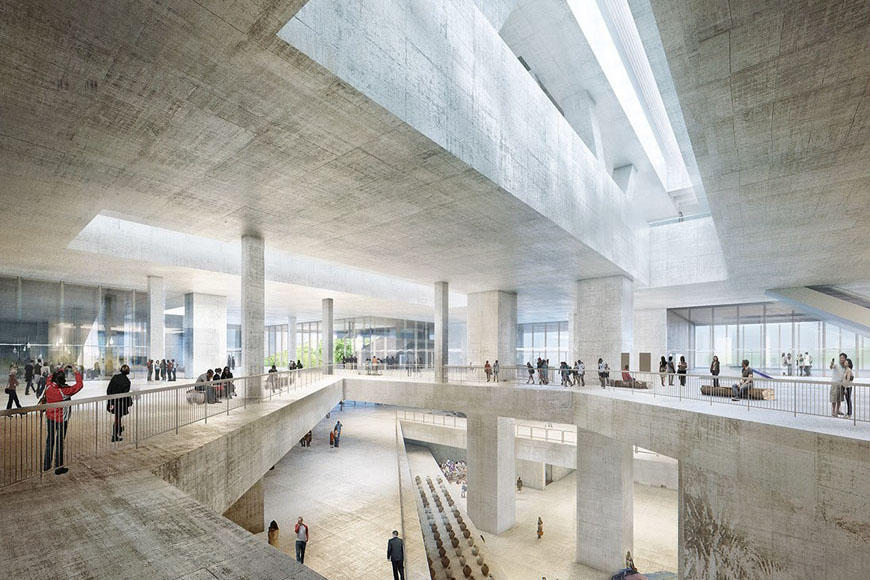 The platform contains a public covered plaza, giving access to all major public functions, the museum shop, a temporary exhibition space, an auditorium, a learning center, and the museum lobby; a vertical cut in the floor slabs, along with providing natural lighting, visually connects the various levels of the museum and reveals the underground level to the visitors.
