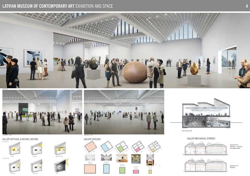 The winning design maximizes natural light, conveyed into the exhibition galleries by roof windows. The proposal, along with being extremely functional, was also appreciated for its references to the traditional timber architecture of Latvia.