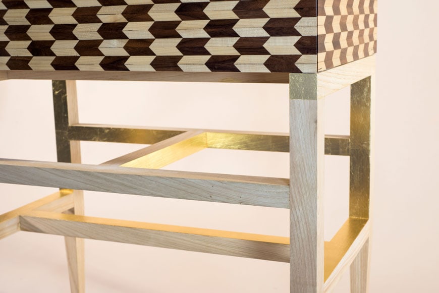 Materials: corroded fir wood, ash, walnut, chestnut, and gold leaf