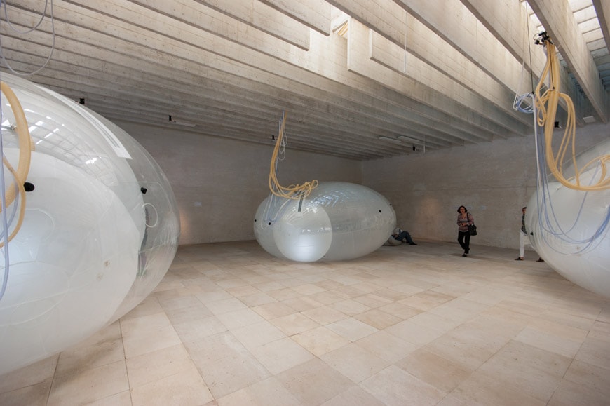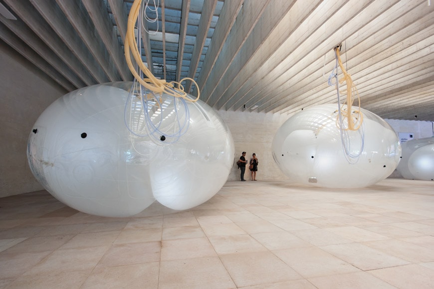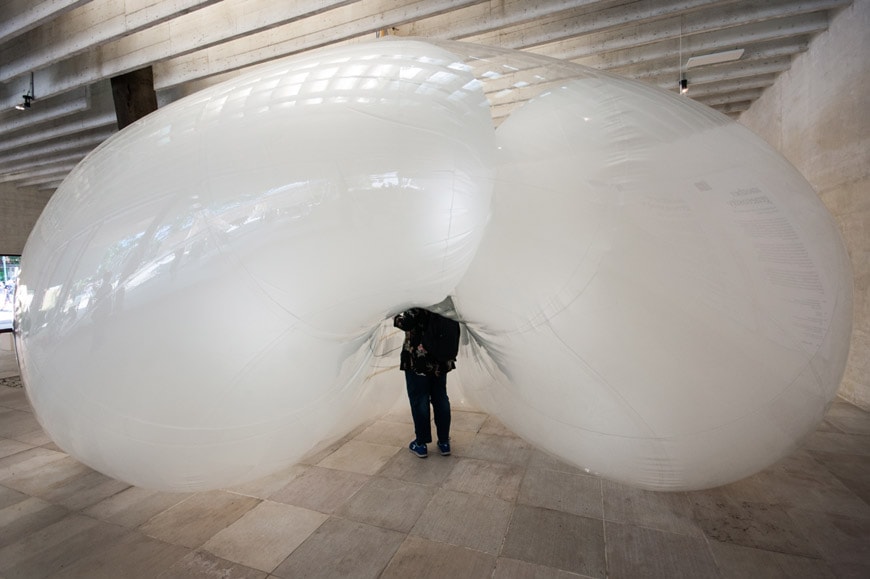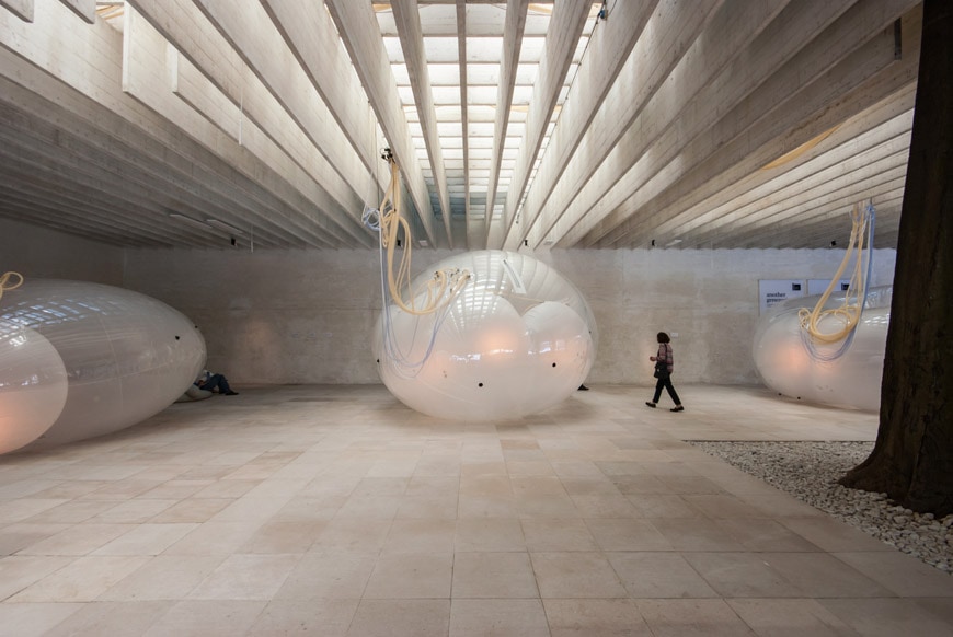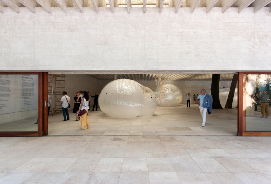 Pensato dunque come un’occasione per esplorare la relazione fra natura e ambiente costruito, “Another Generosity” invita il pubblico alla partecipazione attraverso le discussioni che verranno proposte ma anche, in modo molto più ludico e sensoriale, attraverso un’installazione interattiva di grande impatto visivo, formata da grandi cellule lattiginose disseminate nello spazio del padiglione. Le cellule, che contengono aria e acqua, ovvero gli elementi alla base della nostra vita sulla Terra, rispondono alle sollecitazioni esterne e ai cambiamenti dell’atmosfera, proponendo, inevitabilmente, un nuovo paradigma dell’architettura, non più macchina ma organismo sensibile.