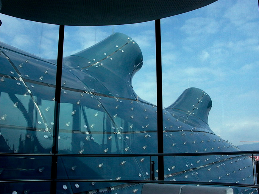 Il lato di ingresso è su Lendkai, lungo il fiume Mur, e dalla strada la si può abbracciare con lo sguardo. Oppure la si può vedere dall’alto, dalla terrazza panoramica dello Schlossberg; seduti comodamente al tavolino del caffè è impossibile non scorgere la massa blu dell’alieno che emerge dal rosso dei tetti del centro storico di Graz.