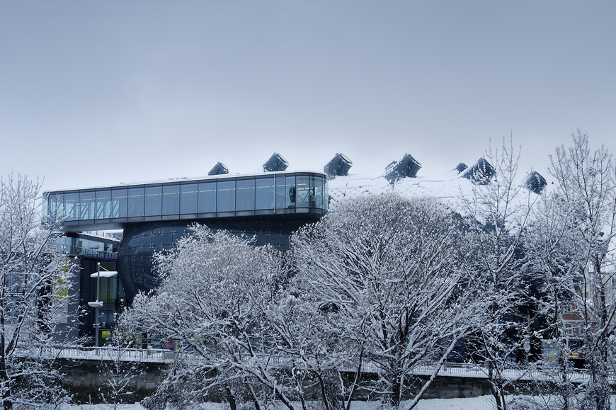 Kunsthaus Graz nella neve. Foto: Universalmuseum Joanneum/N. Lacchè