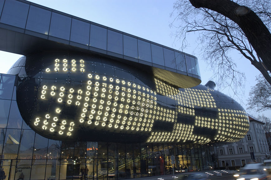 Realizzata dallo studio berlinese realities:united, la BIX-Medienfassade è una pelle comunicante che funziona come supporto per produzioni artistiche: non soltanto trasferisce i contenuti programmatici della Kunsthaus Graz dall’ interno allo spazio pubblico, ma permea tutto il contesto urbano più prossimo. Nei 900 m² di superficie esterna sono integrati 930 anelli a fluorescenza da 40W, con i quali si può ottenere luminosità a regolazione variabile .