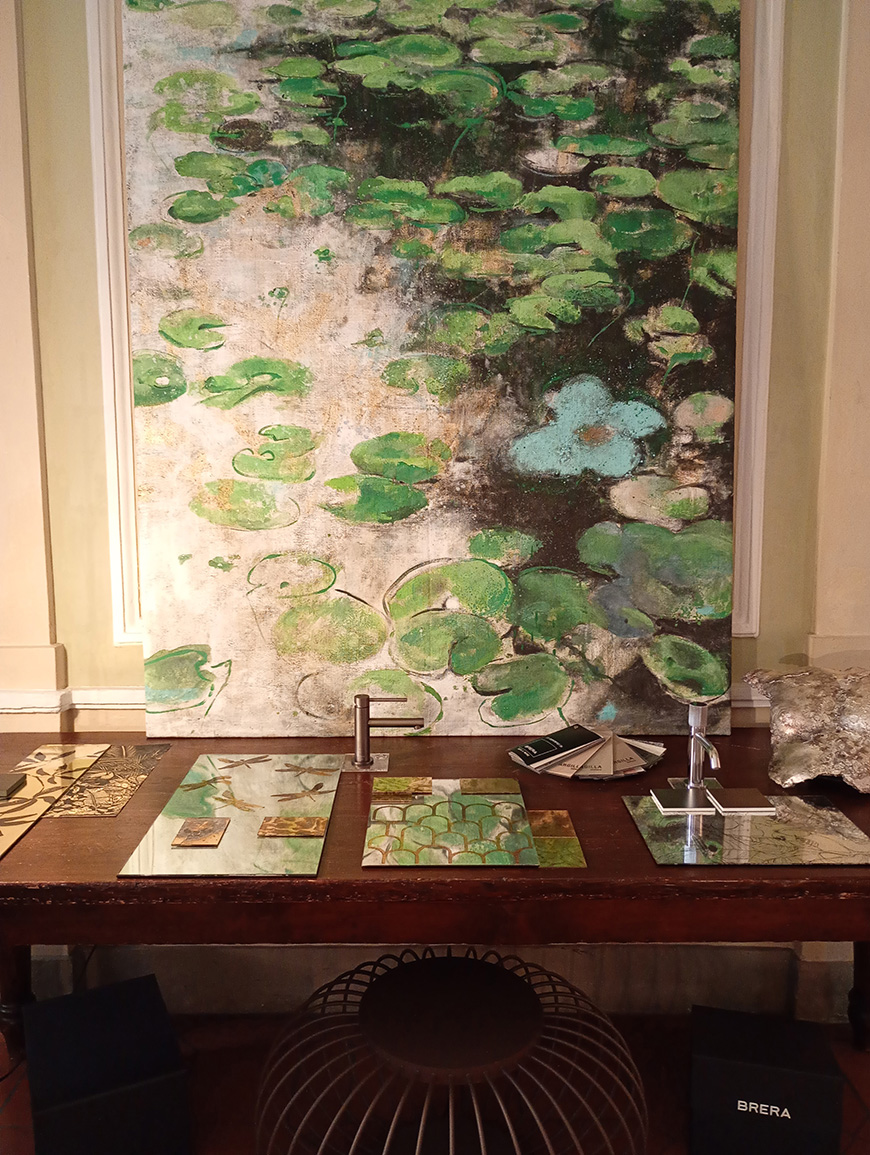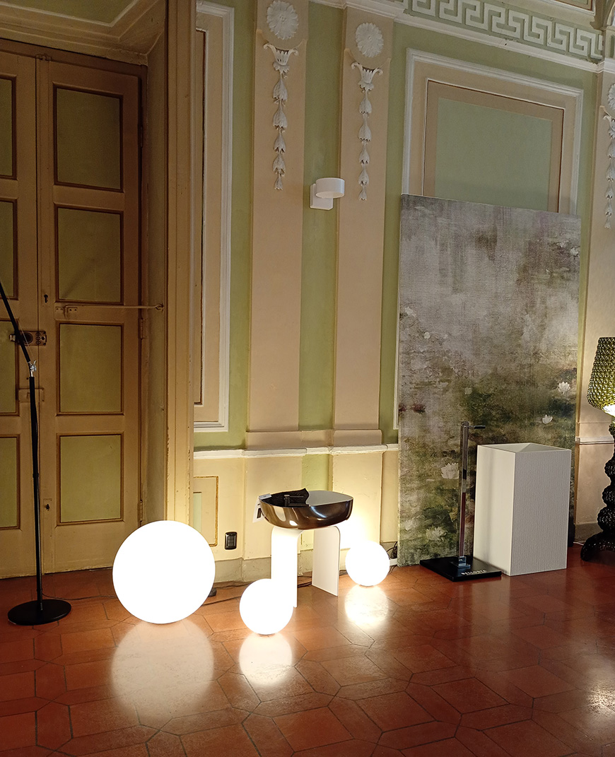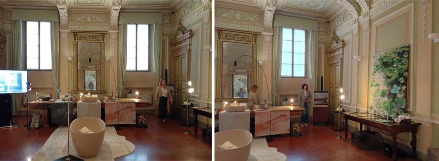 La sala a piano terra del palazzo cinquescentesco che accoglie l’evento è stata trasformata in una sorta di wunderkammer contemporanea: alle carte da parati si affiancano sorprendenti prototipi di specchi decorati, piani per tavoli realizzati in scagliola, pezzi unici, elementi d’arredo giocosi (come gli imbottiti dalle forme stereometriche rivestiti con tessuti colorati), arredi per il bagno e apparecchi d’illuminazione.