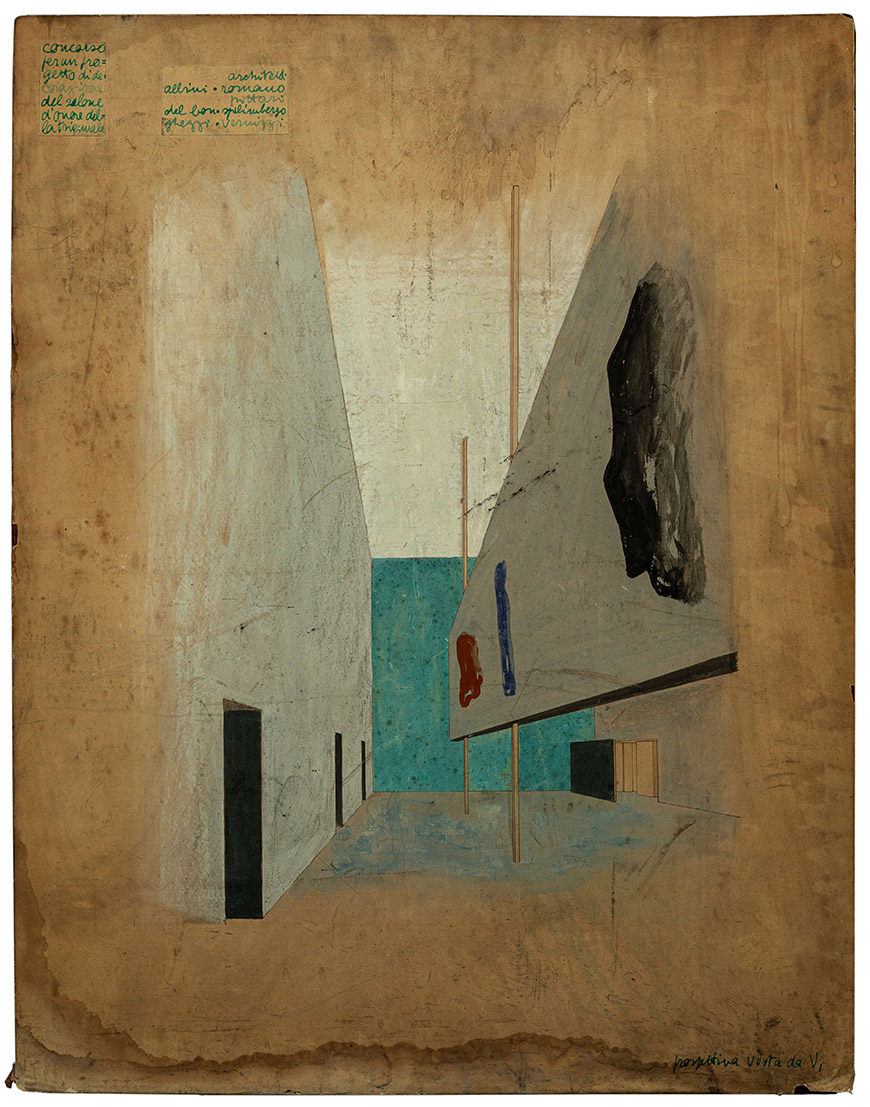 Franco Albini, Giovanni Romano (architetti), Angelo Del Bon, Adriano Spilimbergo, Ghezzi, Renato Vernizzi (pittori), Concorso per un progetto di decorazione del salone d’onore della Triennale di Milano. Prospettiva, disegno, acquerello e inchiostro di china su carta incollata su pannello di legno, 90 x 70 cm, [1936].