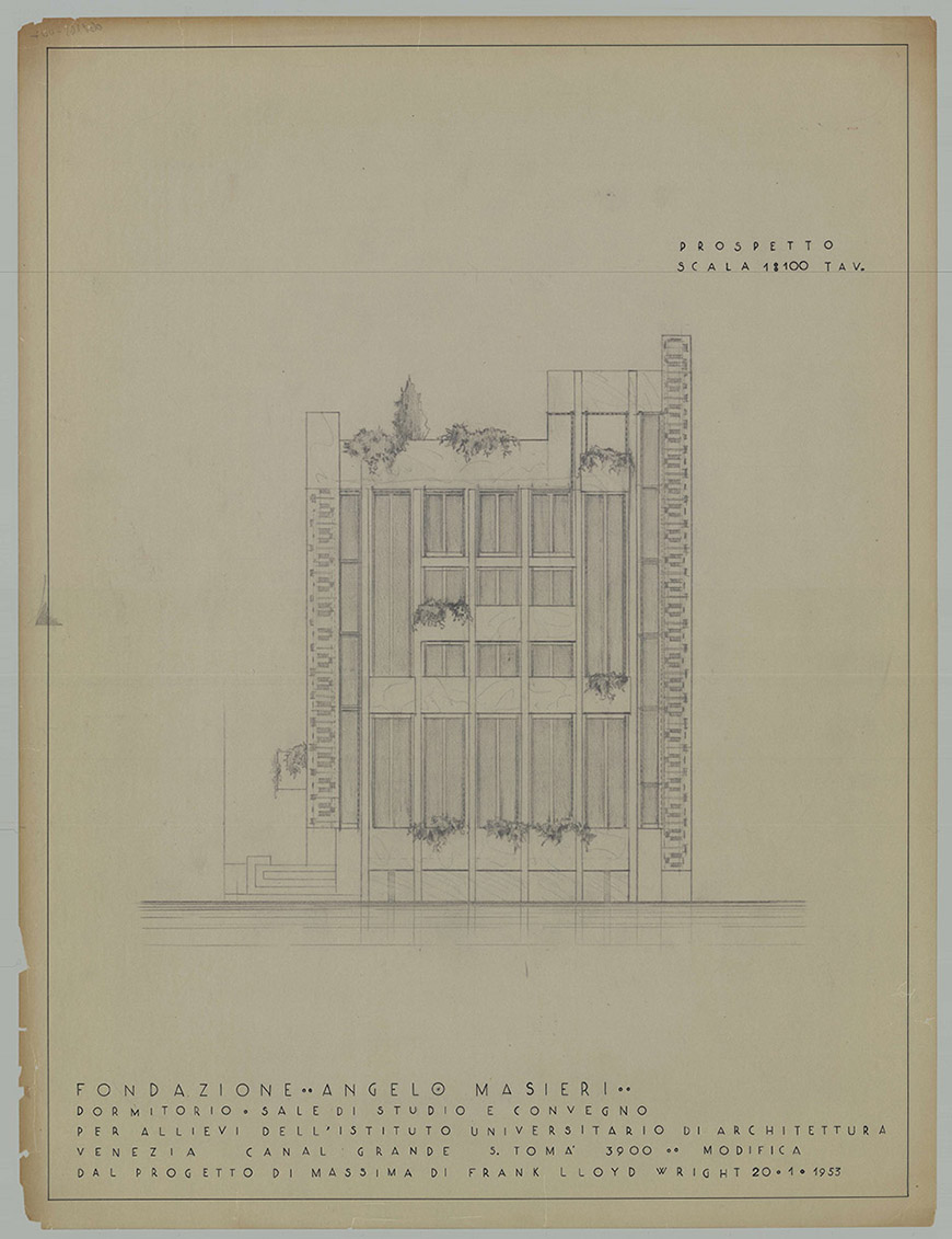 Bruno Morassutti, Fondazione Angelo Masieri: dormitorio, sale di studio e convegno per allievi dell’Istituto di Architettura, Venezia. Modifica del progetto di massima di Frank Lloyd Wright. Prospetto, disegno, inchiostro di china e matita su carta da lucido, 42 x 32 cm, 1953.