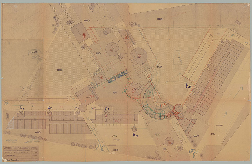 Carlo Aymonino, Maurizio Aymonino, Alessandro De Rossi, Sachim Messarè, Quartiere Gallaratese 2 Milano, disegno, lapis rosso e blu, inchiostro di china verde e pennarello su copia eliografica su carta, firma autografa Carlo Aymonino, 81 x 126 cm, s.d. Archivio Progetti Iuav, Fondo Carlo Aymonino. Courtesy Iuav.