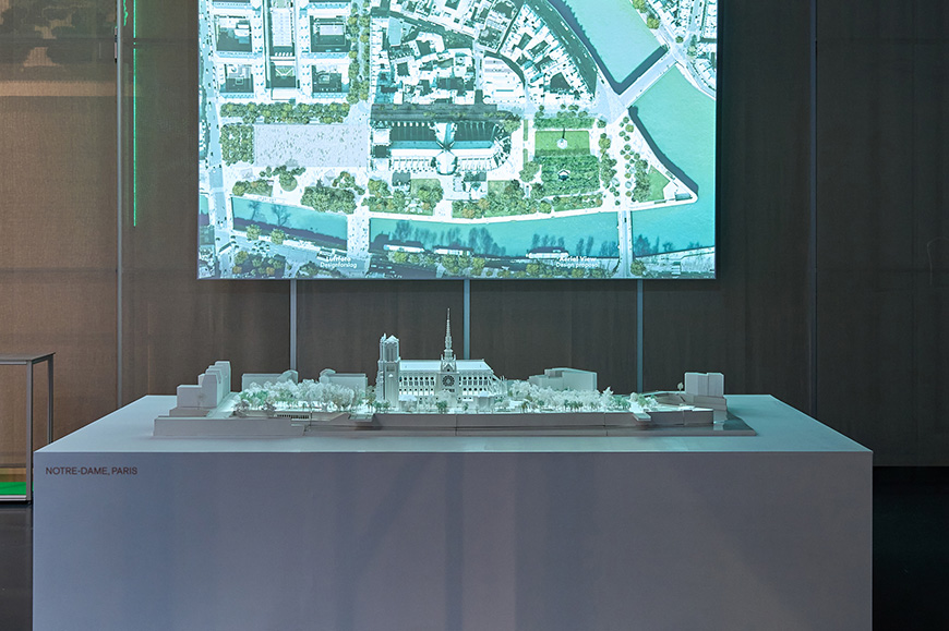 Tra i progetti e le ricerche in mostra ci sono le isole galleggianti dello studio olandese Ossidiana, dove coesistono esseri umani, animali e piante; il progetto Biogenic Building, del team di ricerca del CITA (Center for IT and Architecture), ci mostra come la corteccia intrecciata con erbe marine possa formare elementi strutturali che si biodegradano dando vita a un’architettura progettata per decadere; il progetto del paesaggista Bas Smets, che per lo spazio pubblico intorno a Notre Dame ha applicato processi naturali per creare zone climaticamente controllate – ad esempio sfruttando il vento che arriva dalla Senna, usando gli alberi per creare evapotraspirazione e abbassare la temperatura percepita – dimostrando come gli elementi naturali nello spazio pubblico offrano già soluzioni alle sfide future.