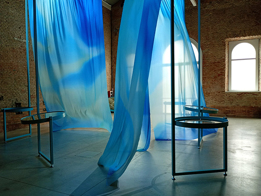 The space is animated by the continuous movement of large silk bellies. Suspended and stirred by breaths of air, the fabrics ripple like a marine surface, generating a fluid, enveloping choreography. Within the context of Milan Design Week 2026, the Sea Room becomes a space for pause and immersion, where sound becomes a communal gesture.