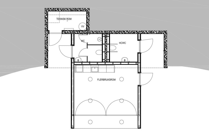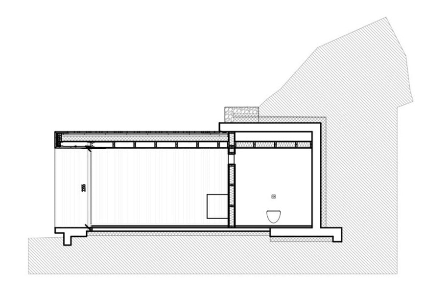 Partially “carved” into the hill on which the radar installation lies, the small 20-square-meter / 215-square-foot service building is made up of two parts: a concrete structure – containing three public toilets and a technical space – buried into the mound, and a wood-clad volume, protruding from the hill slope, which accommodates a multi-purpose room and a small kitchen.